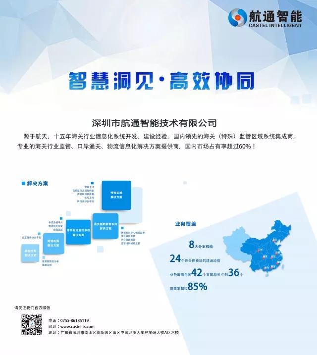 航通智能是國家級高新技術(shù)企業(yè)和雙軟認證企業(yè),并獲得CMMI3資質(zhì)認證。歷程十五載,航通智能已于海關(guān)行業(yè)監(jiān)管、口岸通關(guān)、保稅物流、加工貿(mào)易、物流信息化應(yīng)用集成領(lǐng)域在全國建設(shè)了數(shù)百個特殊監(jiān)管區(qū)與和監(jiān)管場所信息化系統(tǒng)。其中涉及云卡口、大數(shù)據(jù)風(fēng)險分析、北斗/GPS監(jiān)控應(yīng)用、RFID射頻識別、移動智能終端等應(yīng)用技術(shù)。業(yè)務(wù)覆蓋全國42個直屬海關(guān)中的36個,關(guān)區(qū)覆蓋率超過85%,核心業(yè)務(wù)市場占有突破60%。